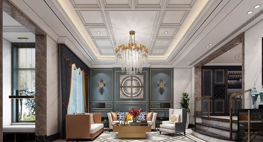 客廳浪漫又不失溫馨的造型,高品質的家具結合墻面大理石的紋理,再加上金屬線條的點綴,體現(xiàn)出現(xiàn)代風格的可塑性,同時又不失品質感的設計語言。整體空間使用米色和藍灰色為主色調,流蘇狀的吊燈唯美又有格調,加上暖暖的燈光,使整個空間有種輕奢高貴的感覺。